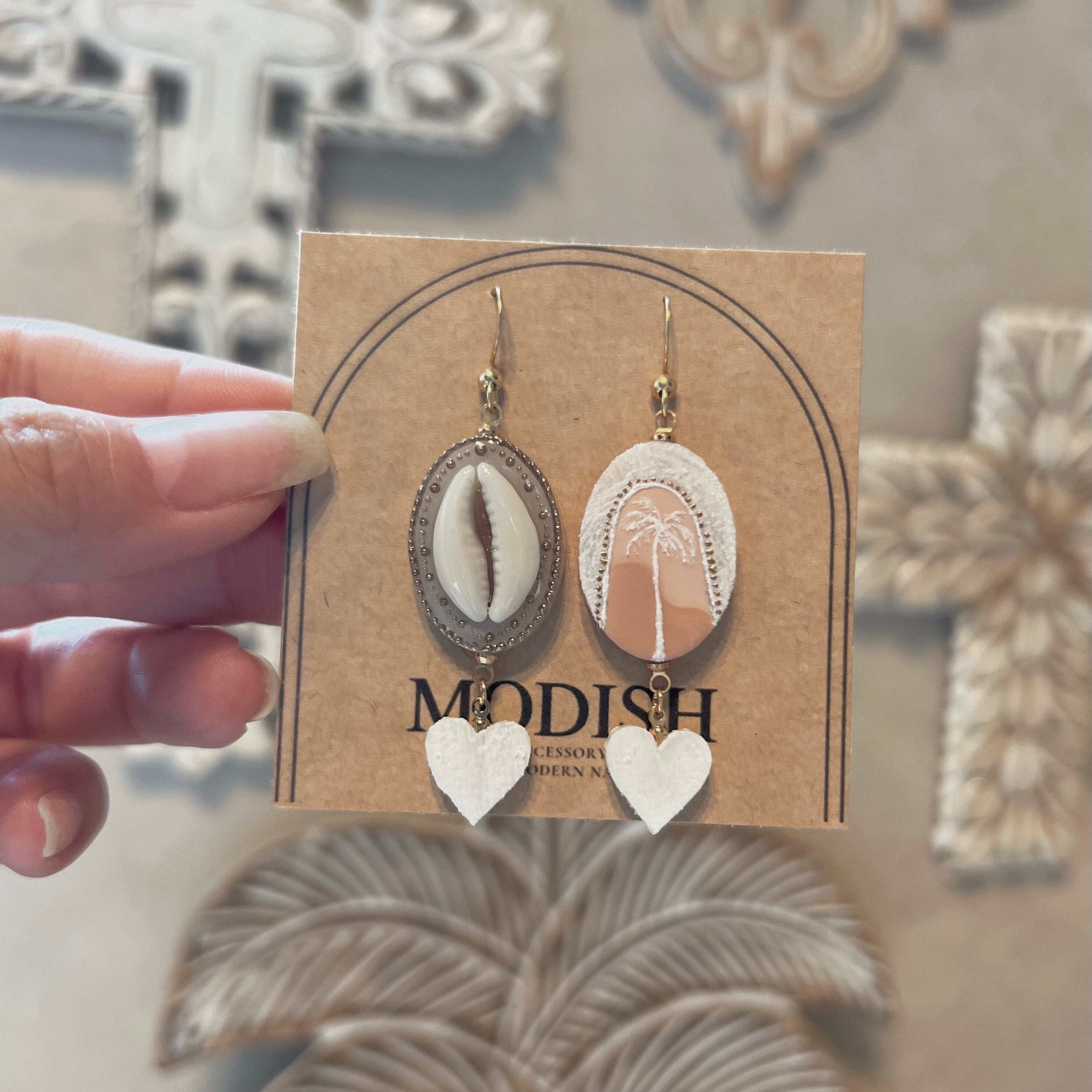 bohoイメージのカウリーシェルとヤシの木のピアスです。
